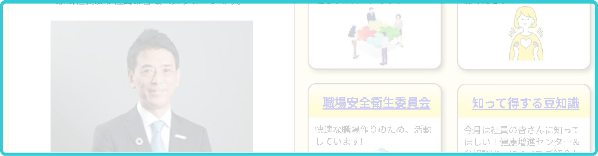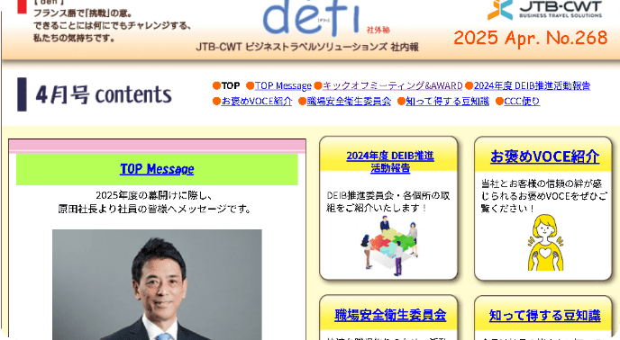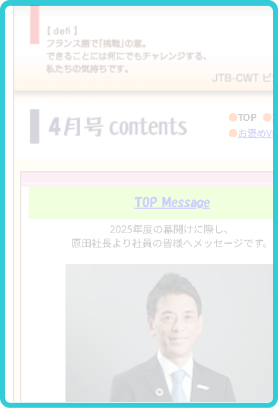毎月更新の社内デジタル報。新入社員紹介から豆知識、社長メッセージまで何でも掲載!日々の業務のひと息タイムに読み、隣のデスクの人との会話のきっかけにも。毎月の更新が楽しみになる情報源です。